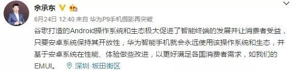 基于国内的猜测与质疑,华为高级副总裁余承东在微博上表示:
