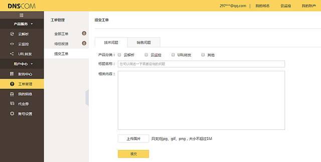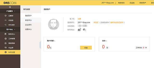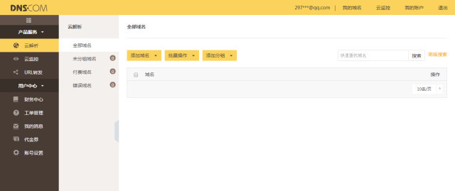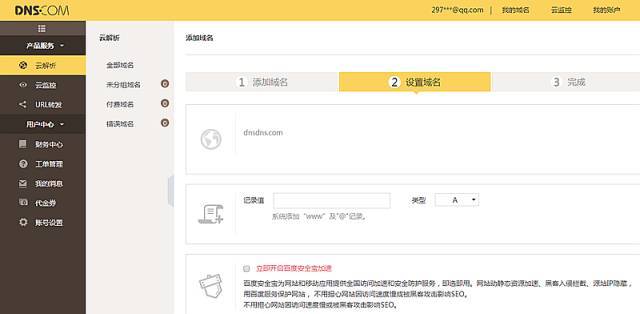 2.0版本产品架构上主要分为产品服务和用户中心两大模块。产品服务主要包括云解析、云监控、URL转发。用户中心主要包括财务中心、工单管理、我的消息、代金券、账号设置。开启邮箱验证,验证之后方可添加域名,点击我的域名进入域名添加页面。