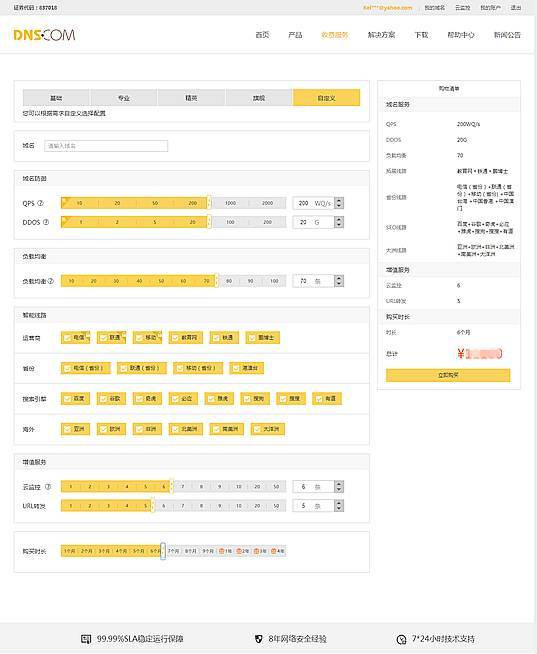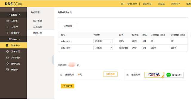 DNS.COM2.0版本新增自定义购买方式。自定义选择购买方式更加自由,按需购买,贴近消费需求。此模式下有域名防御,负载均衡,智能线路,增值服务,购买时长。根据网站需求选择不同模块服务。选择完成后可以看到清晰的购物清单,提示你购买的总价格与各项服务。点击立即购买后来到了最后一步,支付!页面跳转至财务中心——我的订单。又一个新功能——列表可详细看到所购买的各项服务,服务值,时长,订单金额,支付金额。支付的时候可选择第三方支付、账户余额支付或者汇款支付方式。支付过程中如果有我们的代金券可以带来不小的折扣哦!