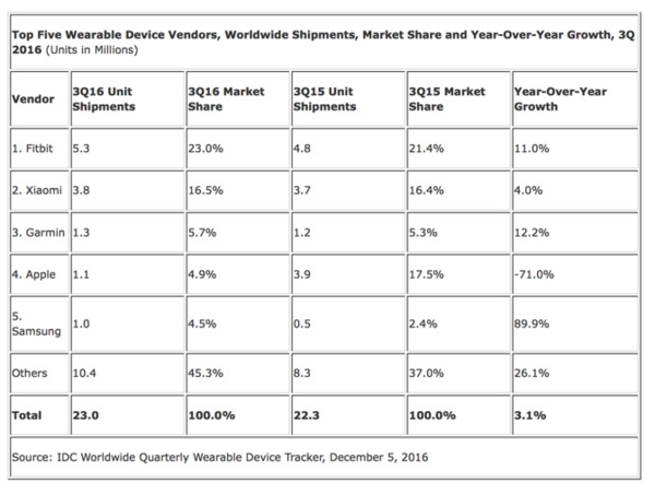 根据IDC发布的《2016年Q3全球可穿戴报告》数据显示,全球可穿戴市场整体呈增长之势,Fitibit以23%的市场份额稳居市场之首,小米则以16.5%位居第二,而排行第三的Garmin其市场份额直线下降至5.7%,苹果以0.8%的微弱差距紧随其后位列第四,三星凭借手表和手环占据市场份额约为4.5%。