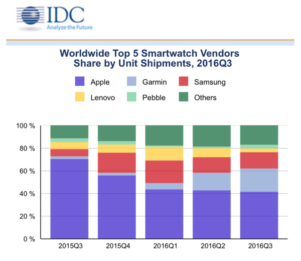 今日,市场调研机构IDC发布《2016年Q3全球可穿戴报告》,其数据显示,苹果Apple Watch的影响力日渐式微,已经排到第四名,占有率为4.9%,较去年同期下降71%。