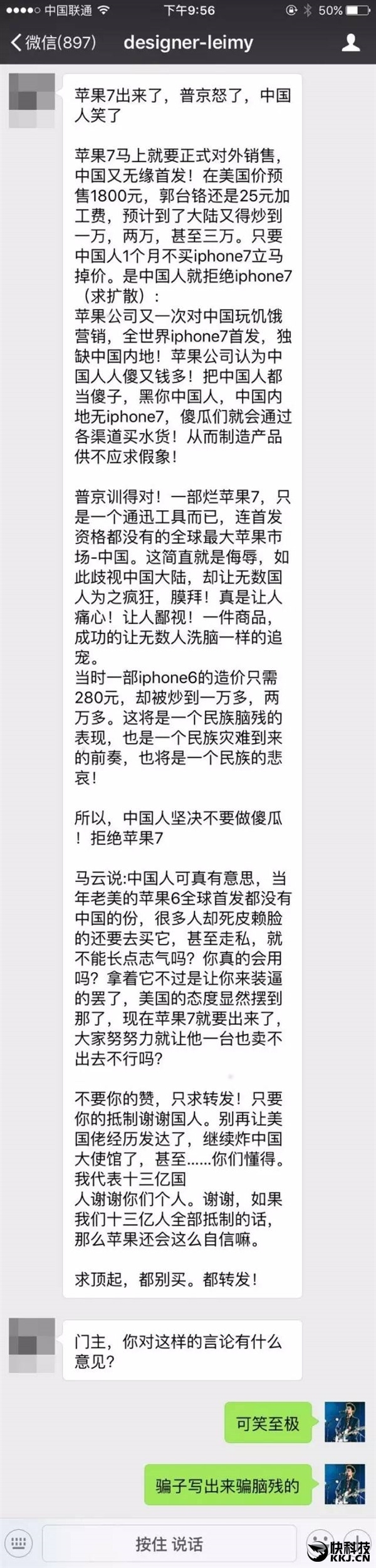在国内用iPhone的人这么多,还能让一条“击沉中国”的无脑贴刷屏,真是无语了。