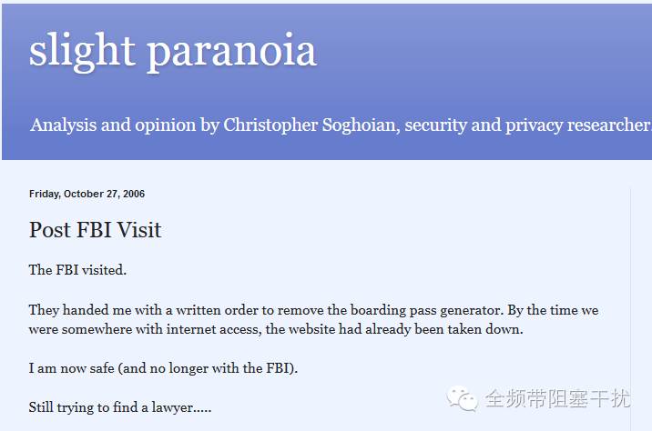 在网站运行一周后,接到举报的FBI探员直接破门而入,在家中实施了逮捕。虽然Soghoian最终获得保释,但该网站在被FBI和TSA警告后已经彻底封掉。如下图,博客中还清晰地记录着从FBI出来的那个日子......可怜的guys。