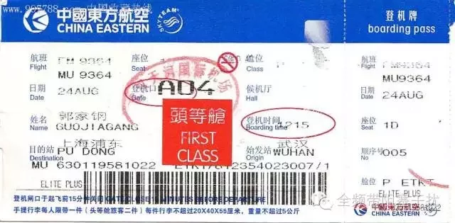 在互联网上搜索一张国内东航的头等舱登机牌,基于Code128编码的一维码,如下图所示: