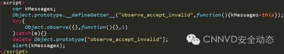 浏览器如果访问如下网页,若能取到kMessages对象,弹出object则存在漏洞,若弹出undefined则不存在漏洞。