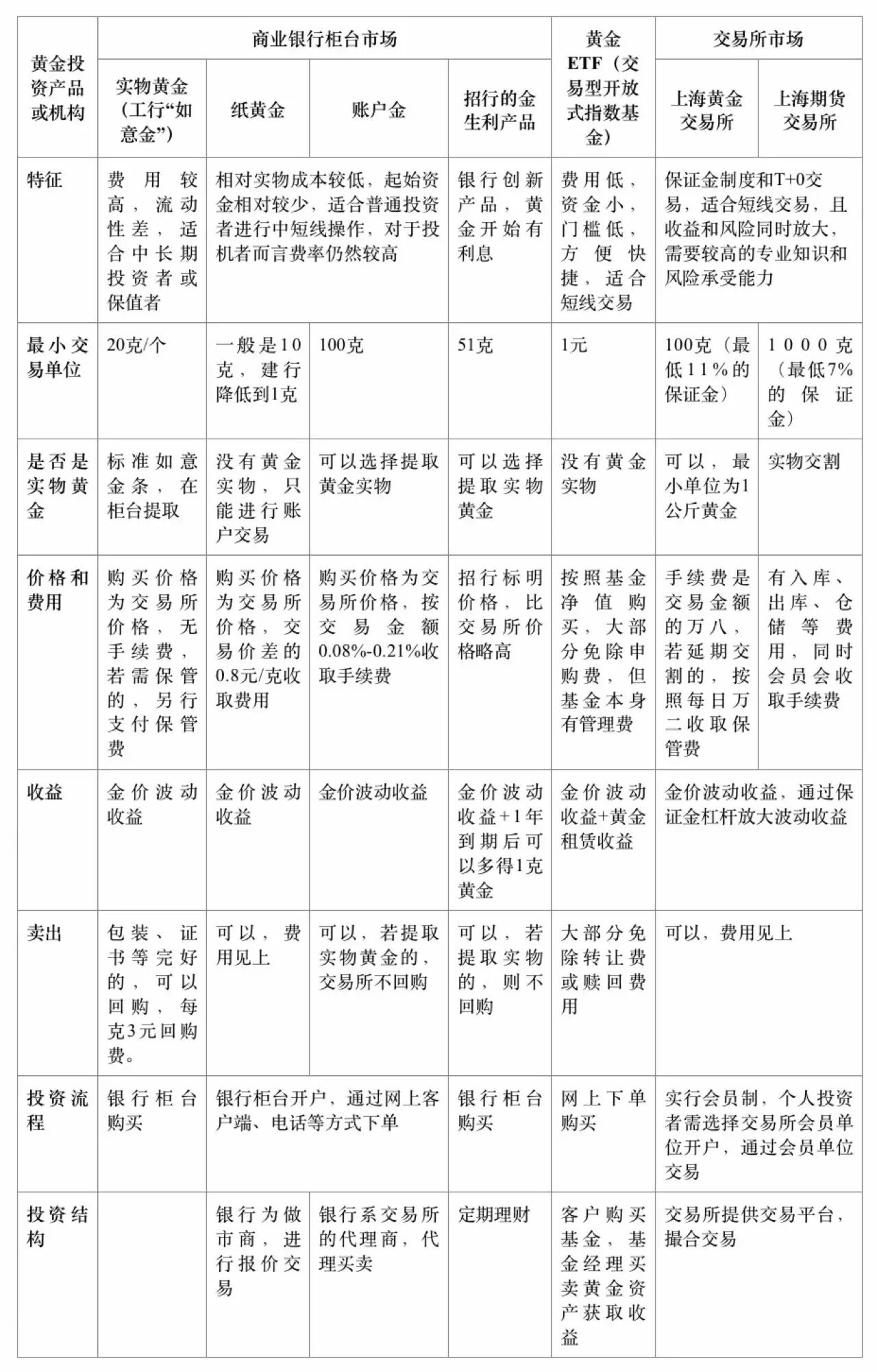 尽管黄金投资的价值和作用已经毋庸置疑,但目前国内已有的黄金投资渠道主要针对机构投资者和专业自然人投资者,针对普通投资者的黄金投资产品除实物黄金投资外,主要以银行柜台市场为主,具体列表分析如下: