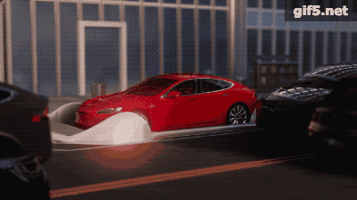 在视频里我们可以看到,在路面上会有一些“停车位”,当汽车驶上这个位置时,会被自动降运到地下隧道里,随后,汽车会被以极快的速度传送出去。汽车在地下隧道的传输不只是单线运作,也可以根据实际需要更换线路。